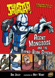 Not only does the reader get to star as Agent Mongoose (suave genius with an arsenal of high tech and high kicks) in Agent Mongoose and the Hypno-Beam Scheme and an upcoming sequel, she (or he) makes some guest appearances as a secondary character to help the reader (a different “you”) out of a few scrapes in other Twisted Journeys books penned by Dan Jolley (including this season’s Shipwrecked on Mad Island—mad scientists gone wild). Three different artists have tackled the character so far (Matt Wendt for Agent Mongoose and the Hypno-Beam Scheme, Court Huddleston for Shipwrecked on Mad Island, Dave Witt for… well, wait and see), who’s always conveniently in disguise. I hope readers will have fun spotting the Mongoose wherever he/she/it(?!) appears.