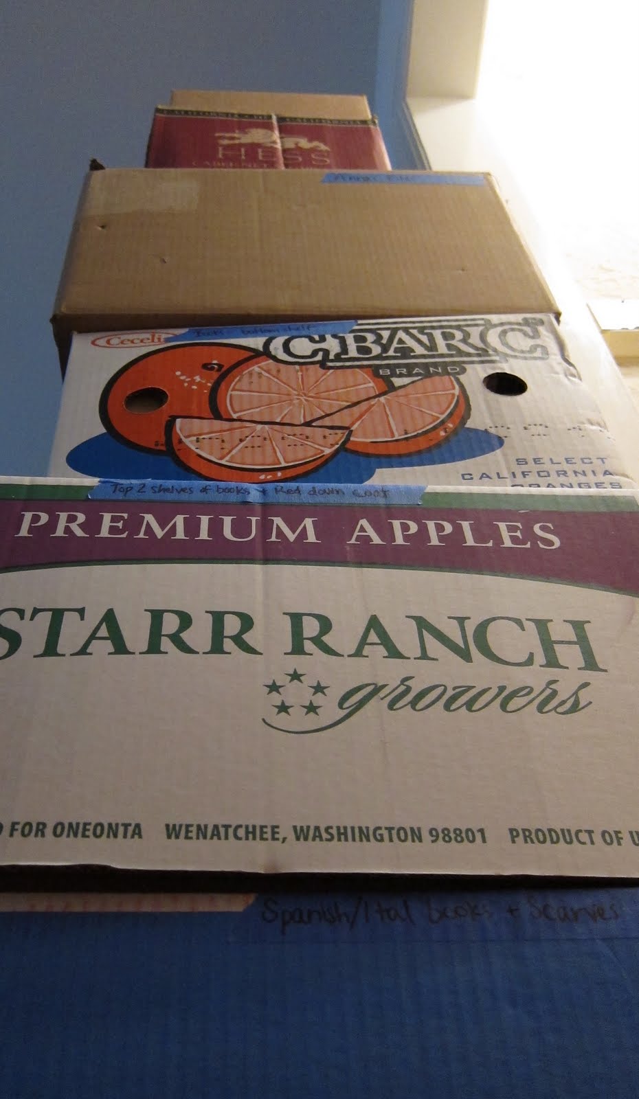 Language books and non-English books: into a box. The dictionary/CMS/old Italian textbook really weigh that one down. Scarves in the top of that box.